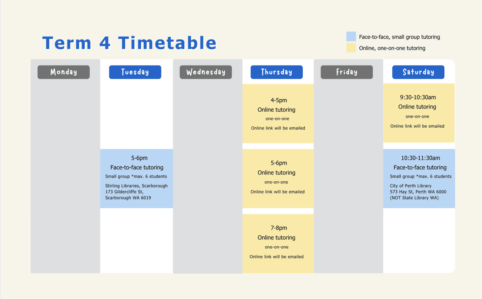 Private one-on-one online tutoring sessions with Ms Rad. One-hour time slots are available on Thursday afternoons. Weekly slots can be booked in advance or more sporadically at a student's point of need (e.g. assessment help).